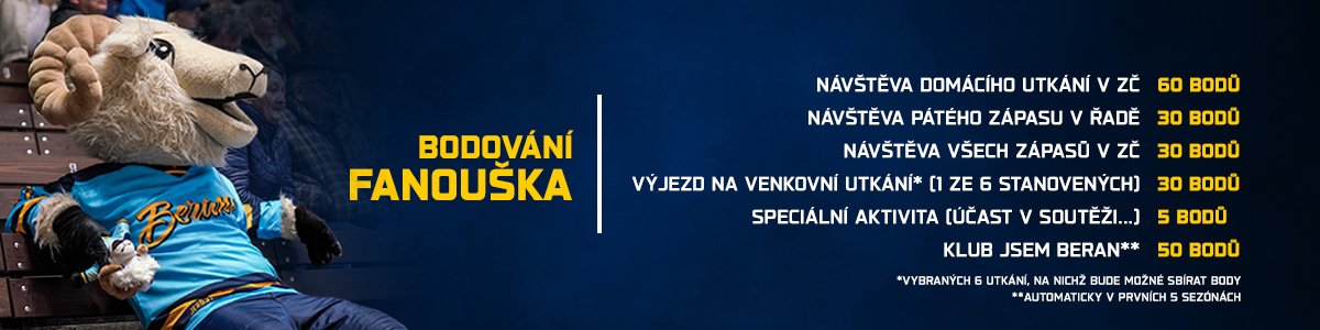 Věrnostní program BERAN odměňuje všechny fanoušky, kteří jsou našemu klubu opravdu věrní. Za každou návštěvu domácího utkání a vybraných venkovních zápasů sbíráš body, které tě postupně posouvají do vyšších fanouškovských úrovní, kde se postupem času můžeš stát Zlatým Beranem, tedy nejvyšší úrovní fanouška Beranů. Body můžeš taktéž získávat zakoupením občerstvení na zimním stadionu či účastí na vybraných aktivitách a soutěžích např. v průběhu domácích zápasů.